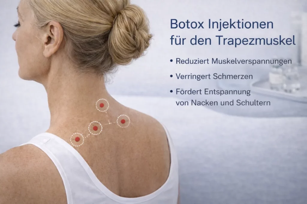 im Bereich der Hals- und Nackenmuskulatur dient der gezielten Entspannung überaktiver Muskeln in der sogenannten Schulter-Nacken- bzw. „Kragen“-Zone. Sie kann sowohl aus ästhetischen als auch aus funktionellen Gründen eingesetzt werden, z. B. bei muskulären Verspannungen, Spannungskopfschmerzen oder stressbedingter Muskelüberaktivität.